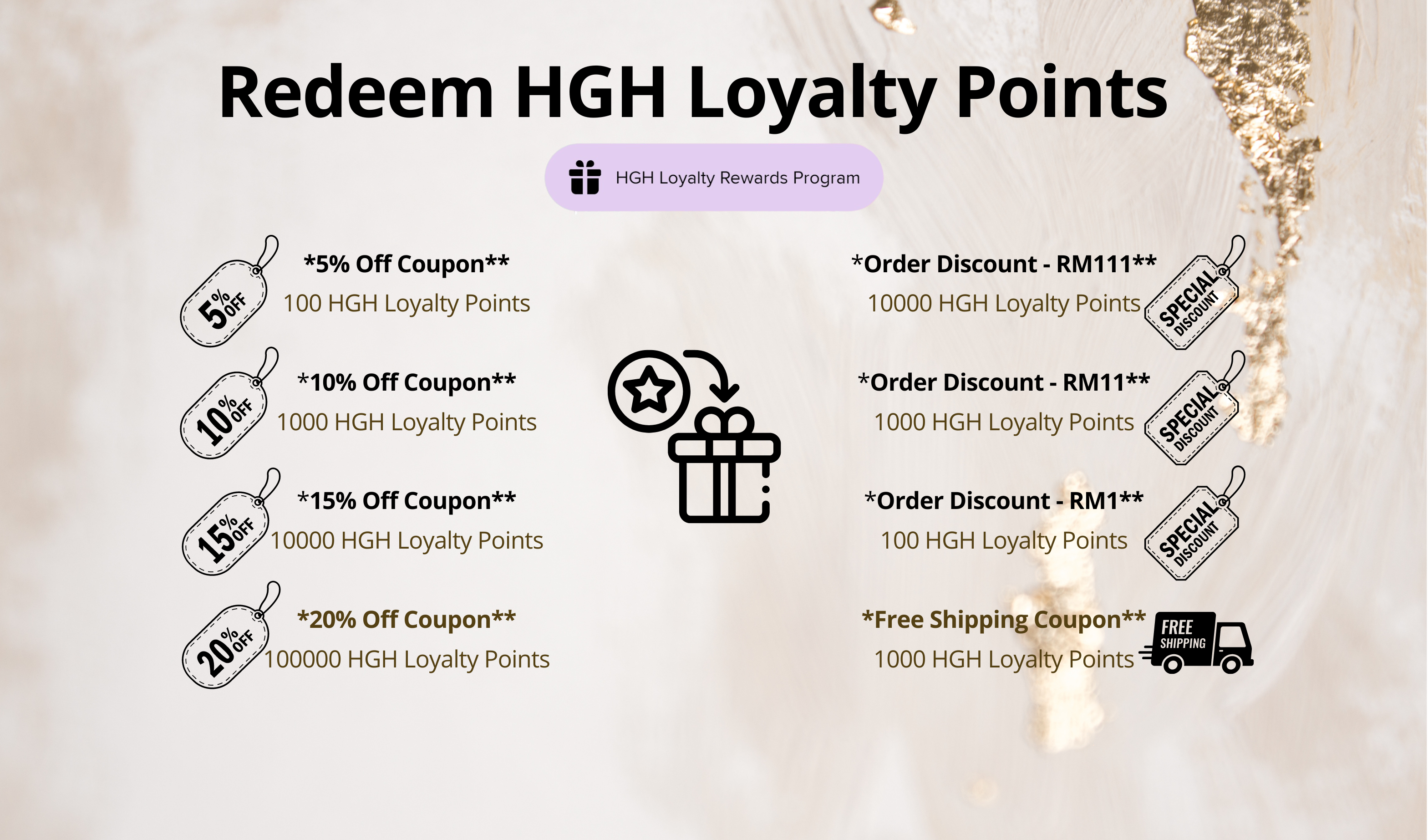 Browse our redemption options and see how you can enhance your shopping experience with HGH Loyalty Points. The more points you collect, the more you can enjoy—start redeeming today!
