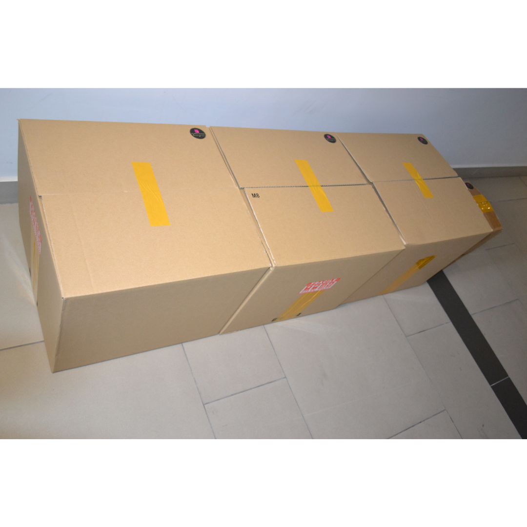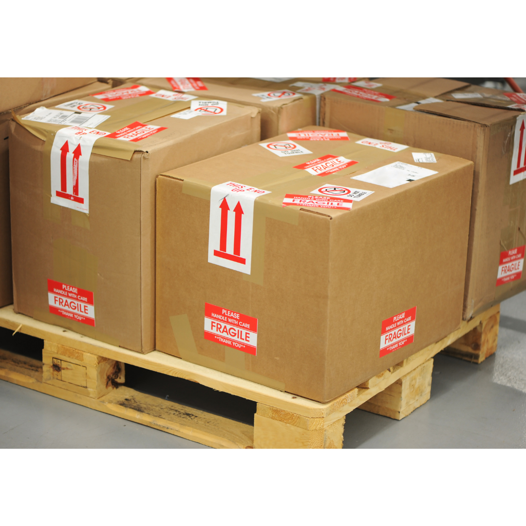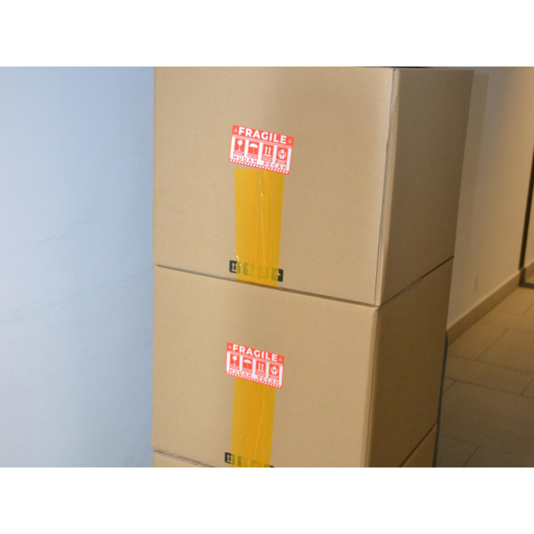 The external carton box is sealed securely with masking tape. Fragile labels are then strategically placed around the box to alert delivery partners to handle the package with extra care.