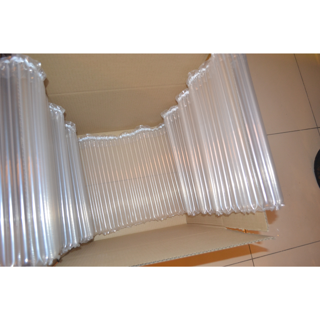 Bubble columns and shrink wraps are placed at the bottom of the carton box to create a cushioning foundation for the contents.