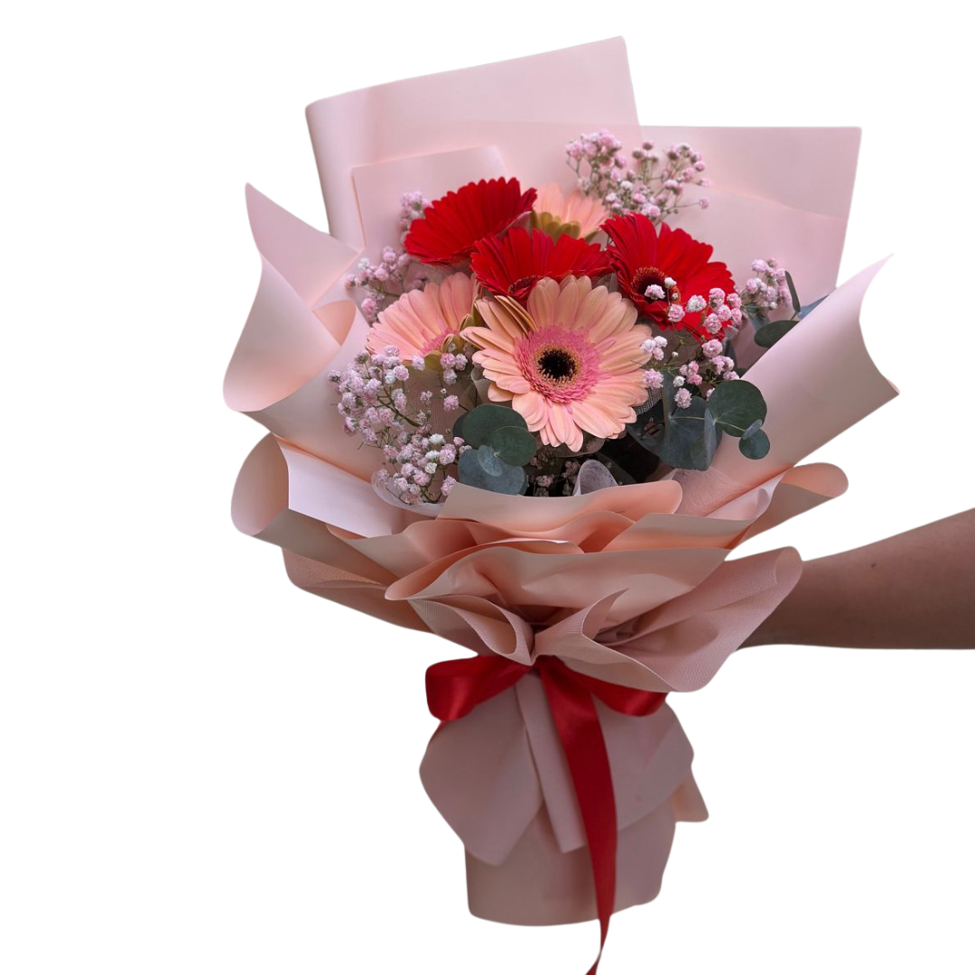 A gerbera daisy bouquet is a stunning display of vibrant blooms that radiate joy and positivity. With their bold colors and unique shape, these flowers are perfect for any celebration or as a cheerful pick-me-up. Symbolizing beauty and cheerfulness, gerbera daisies make an ideal gift for birthdays, graduations, or simply to brighten a loved one's day. Their lively presence adds a touch of whimsy to any setting, creating an uplifting atmosphere that brings smiles and warmth to all who see them!